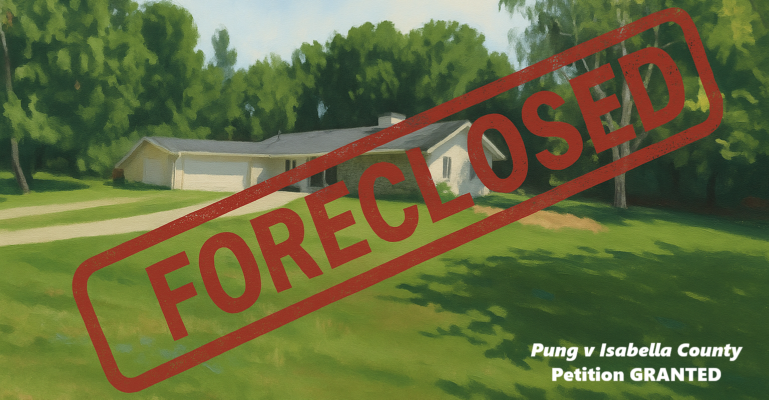 The case arises from a long-running dispute over Michigan’s Principal Residence Exemption (PRE) on the Pung family home. After the local assessor revoked the PRE for 2012, the then-County Treasurer, Steven Pickens, proceeded to foreclose over an alleged (but not actually owed) tax delinquency of about $2,241.93. The home — assessed at $194,400 at the time — was auctioned by Isabella County for only $76,008 and quickly resold by the purchasing speculator for approximately $195,000. The County retained the auction proceeds beyond the alleged debt, wiping out more than $118,000 in owner equity. Today, the home has greatly increased in value.